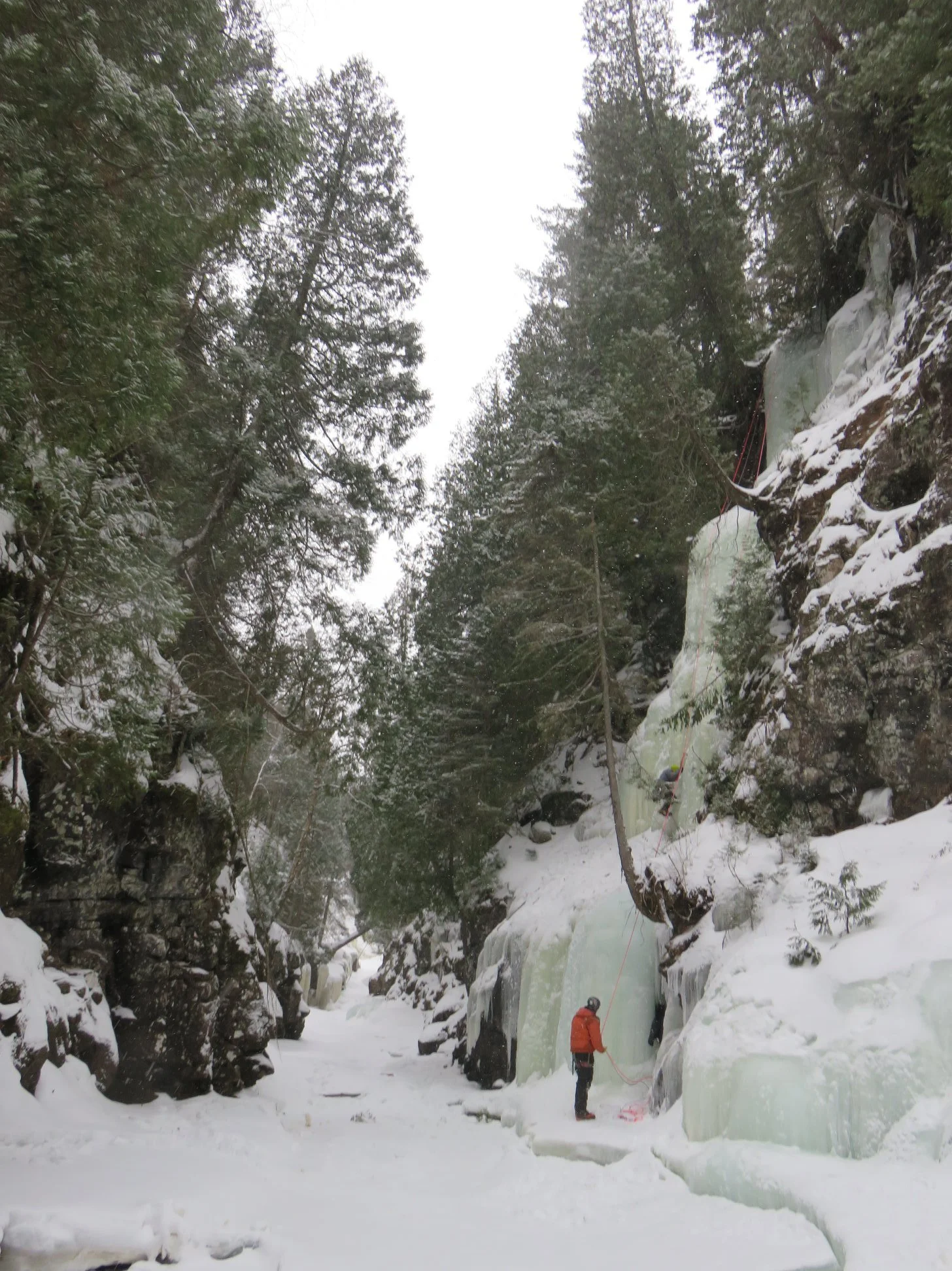 The Ice Park typically sees climbable ice from late December to early March. The Ice Park is free and open to the public. All climbing is at your own risk. You are responsible for yourself. Cliff-top access is available via a short hike. Top-rope anchors can be set using trees and bolts.